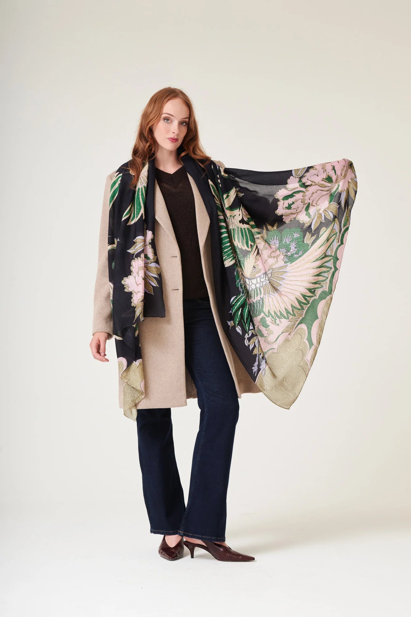 Embrace timeless elegance with this striking crane scarf, where graceful birds in sand, pink, and emerald soar across a sophisticated nearly-black base. Symbolising good fortune and longevity, the crane print draws from classic design traditions. Measuring a generous 100cm x 200cm, this versatile piece transitions effortlessly from winter layering to summer draping, offering refined style across every season.