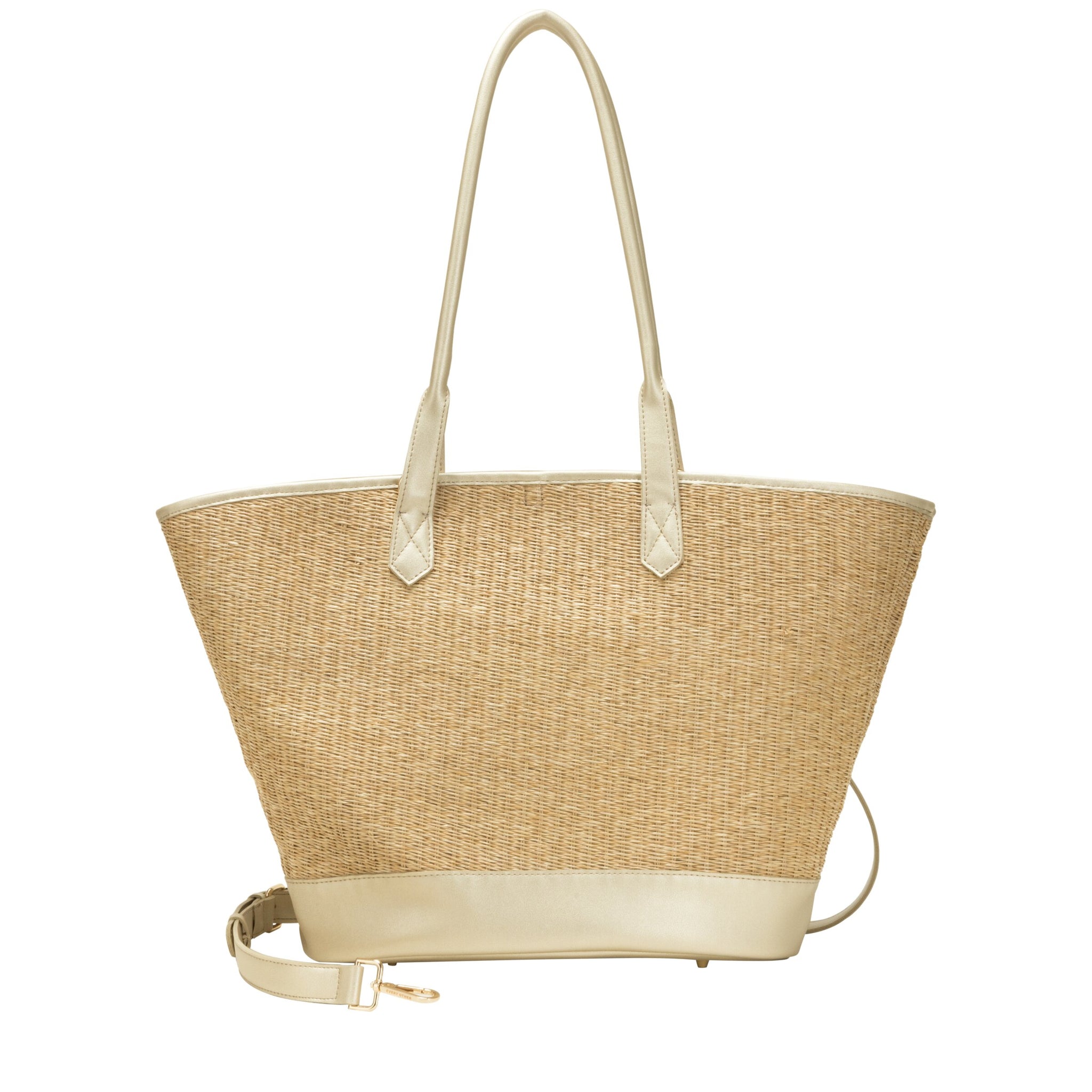 Elevate your summer wardrobe with our stylish rattan tote bag. Featuring ample storage, making this bag the ideal summer companion for beach days, picnics, and everyday outings. Features a clasp closure for secure storage, Double shoulder straps for a comfortable fit, Adjustable and removable crossbody strap for customisable wear, Accented with elegant gold hardware for a touch of sophistication, Branded hardware showcases quality craftsmanship, Studded feet on the base for protection, Interior pockets keeps valuables organised, Includes a removable pouch for added functionality, Crafted from straw-look fabric for a summery aesthetic