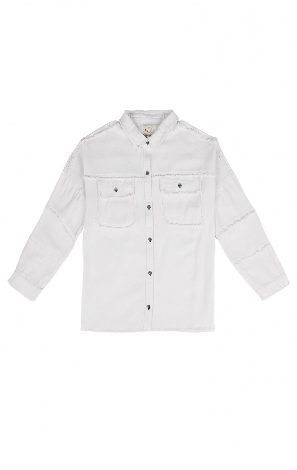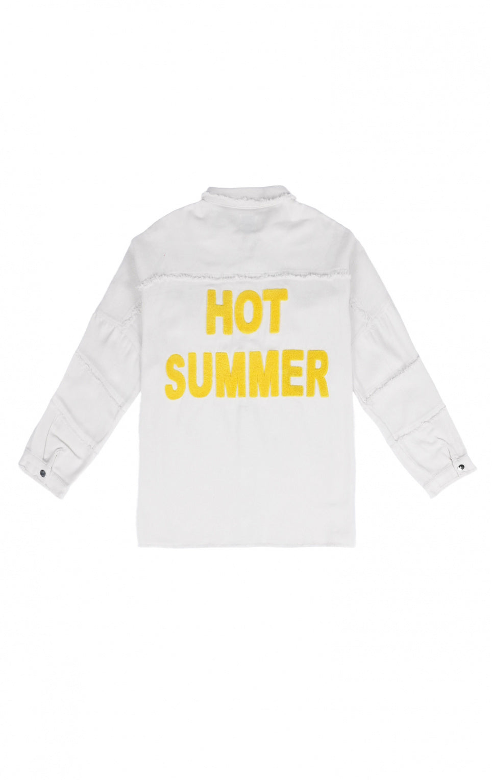 The JYSKO jacket is shaped like a shirt jacket, with frayed details on the collar and pockets. It fastens with silver snap fasteners, also found on the patch pockets. Shown here in white with yellow embroidery on the back.