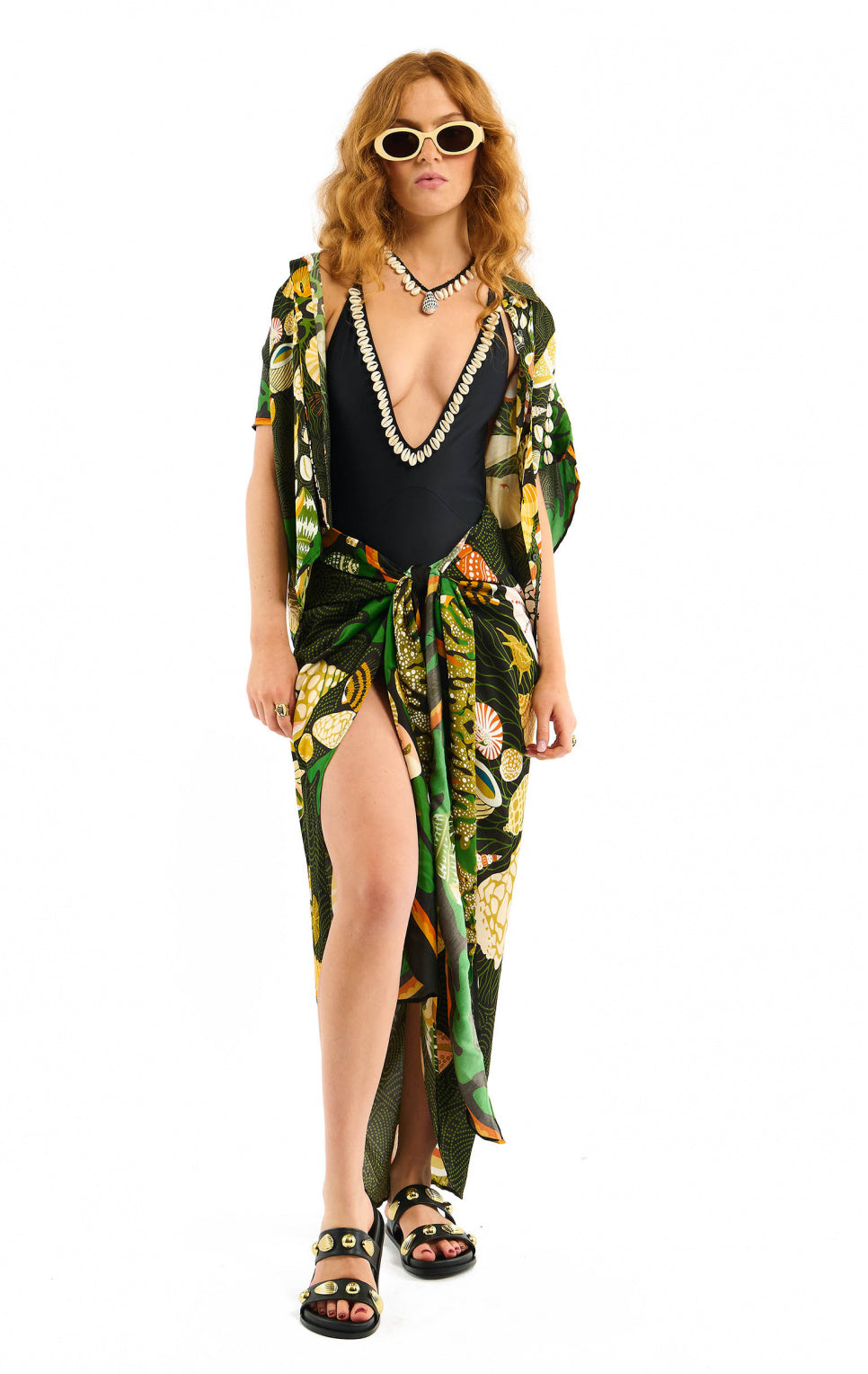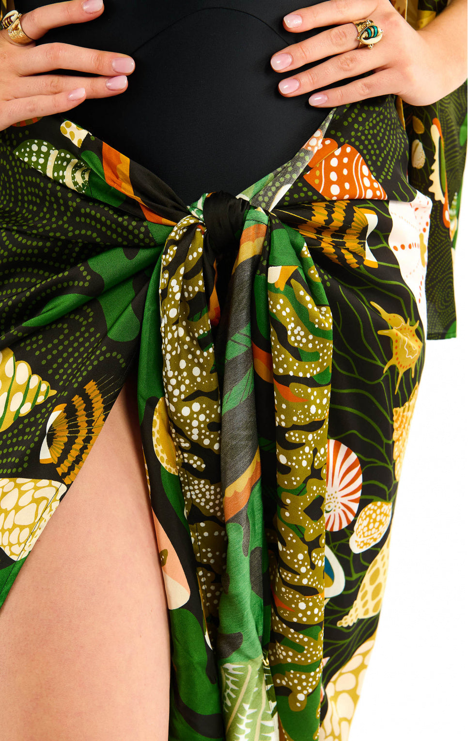 Tied at the front and beautifully opened with a central slit, the NEIJI skirt in its black version, has motifs of shells, corals, crustaceans and aquatic creatures come to life in a ballet of chocolate, ochre, khaki, yellow and white shades on a deep black background.