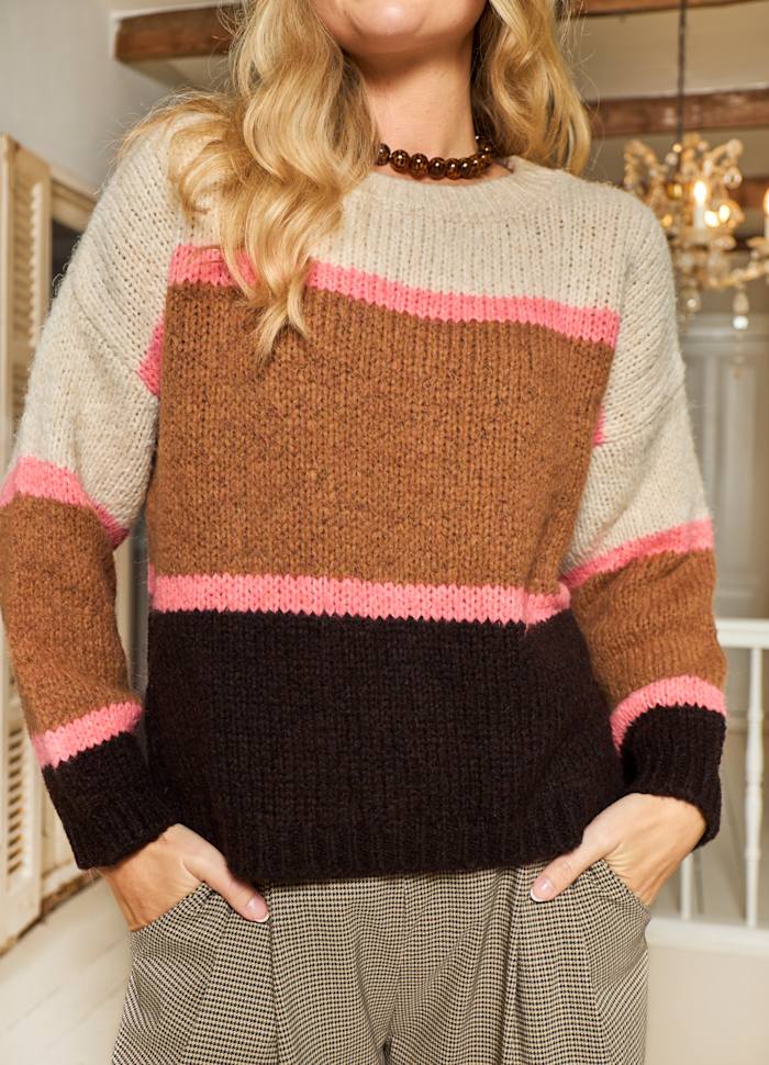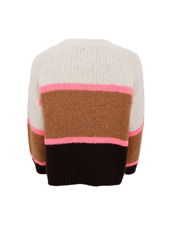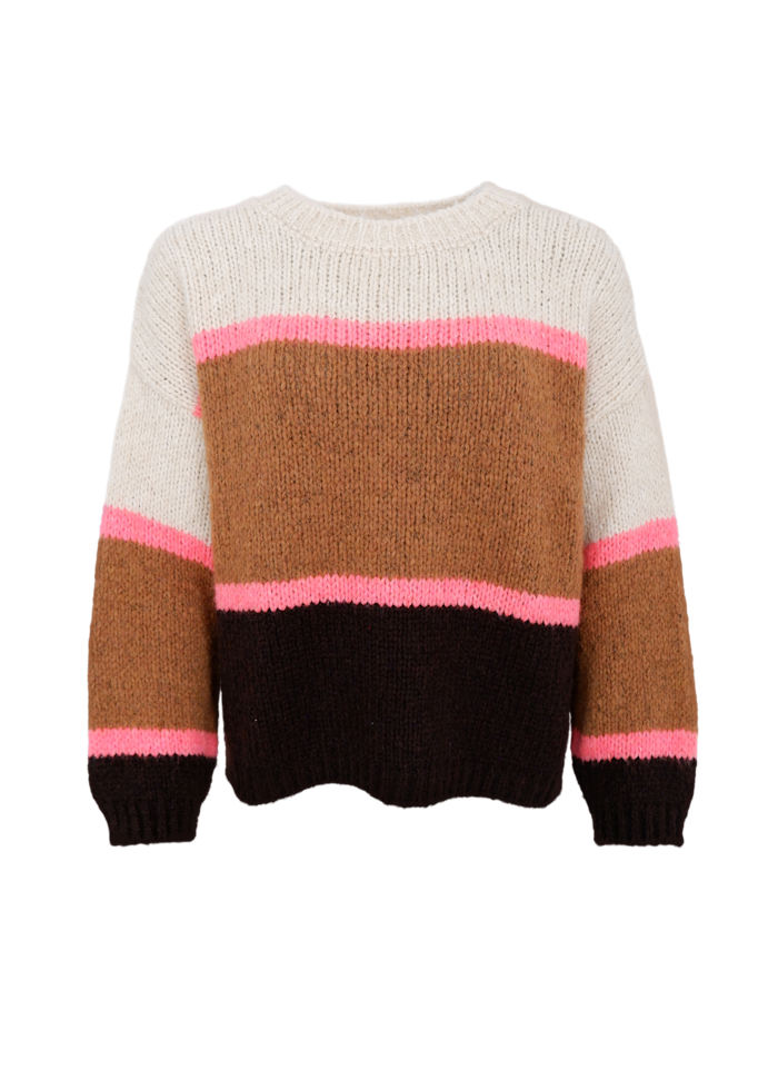 Knitted sweater in a soft and warm quality with a colorful striped design. The model has a round neck, long sleeves and ribbed edges, which gives a relaxed and comfortable fit. The wide color blocks combined with neon details give a modern and fresh look, perfect for both everyday wear and layering throughout the season.