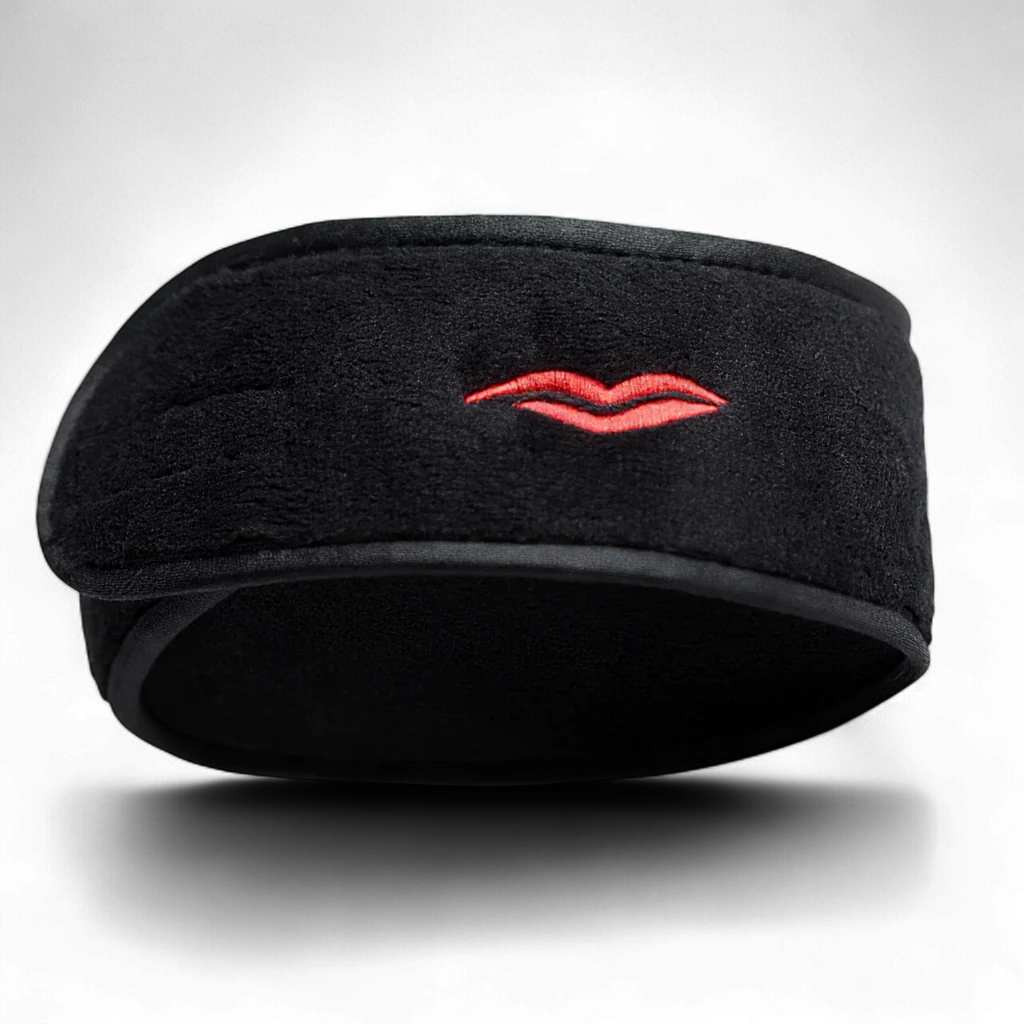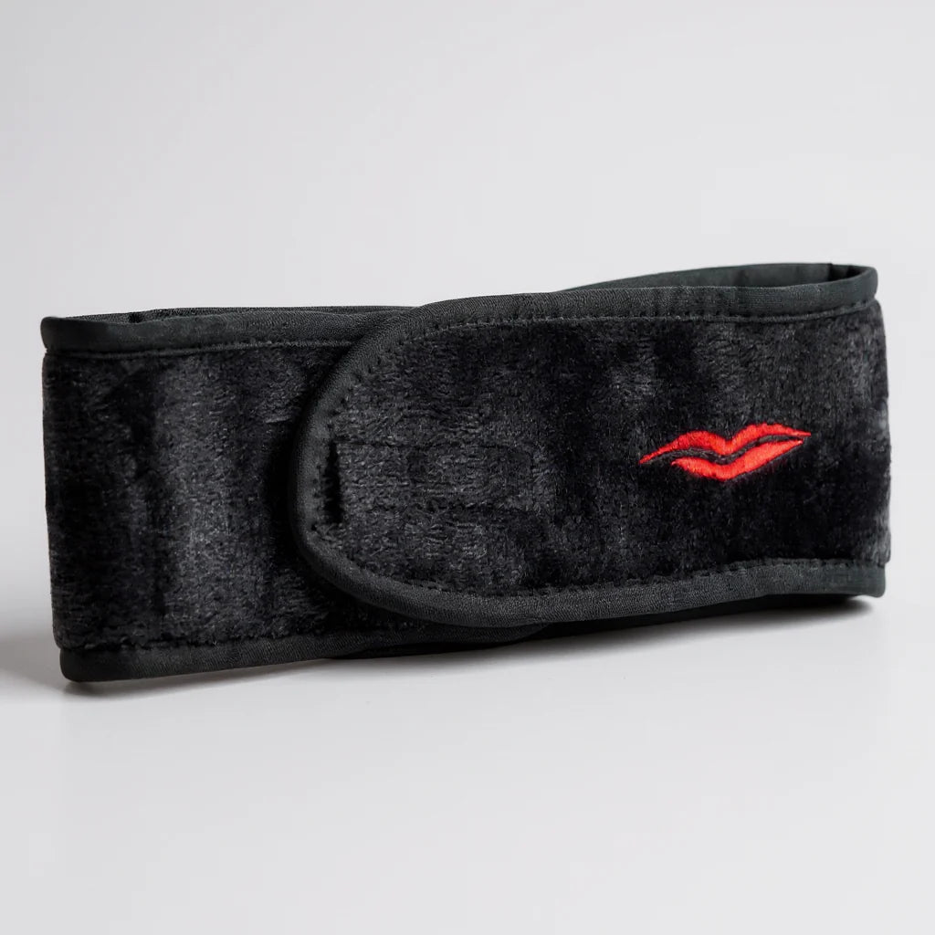 Crafted from super-soft black microfibre, this headband gently keeps your hair back while you cleanse, mask, or apply makeup — no tugging, no slipping, no stress. The adjustable Velcro fasteningensures a comfortable fit for every head size, while our signature embroidered red lip adds that unmistakable DML touch.