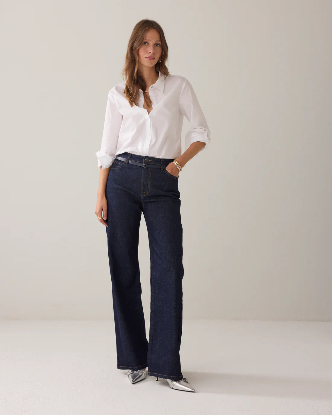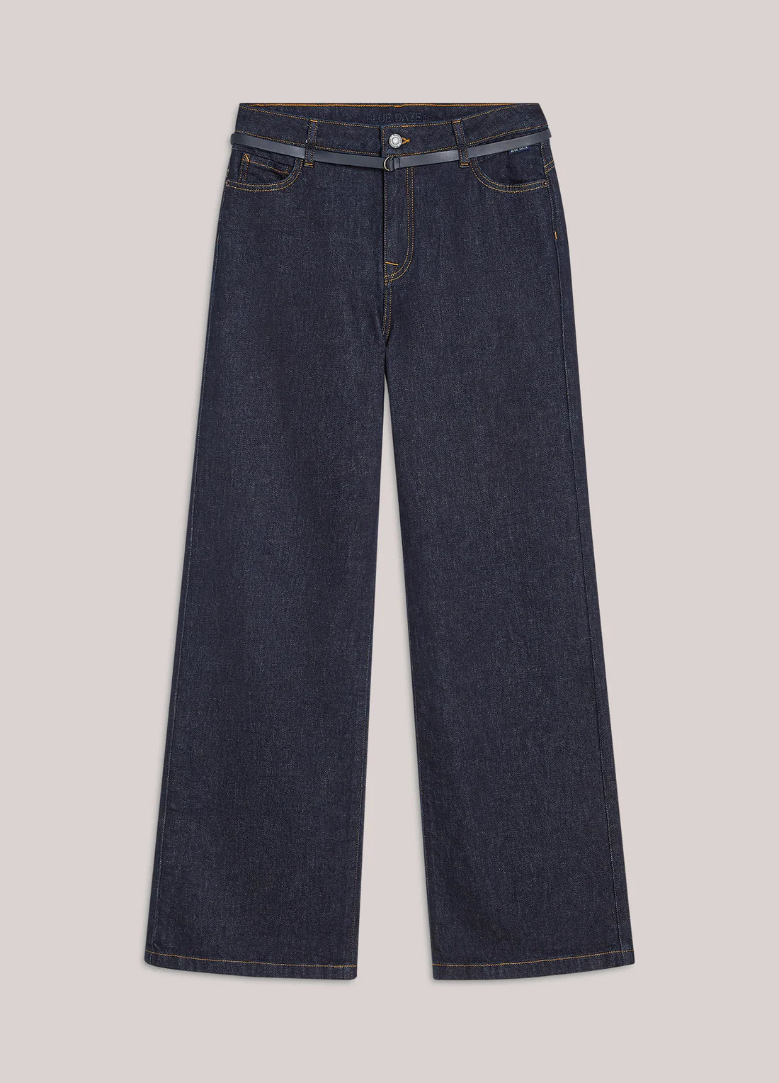 Wide-leg jeans in a deep rinse wash, made of twill denim with comfort stretch. The trousers come with a thin navy belt made of faux leather. Complete the denim look with the matching corset: 2s3383.