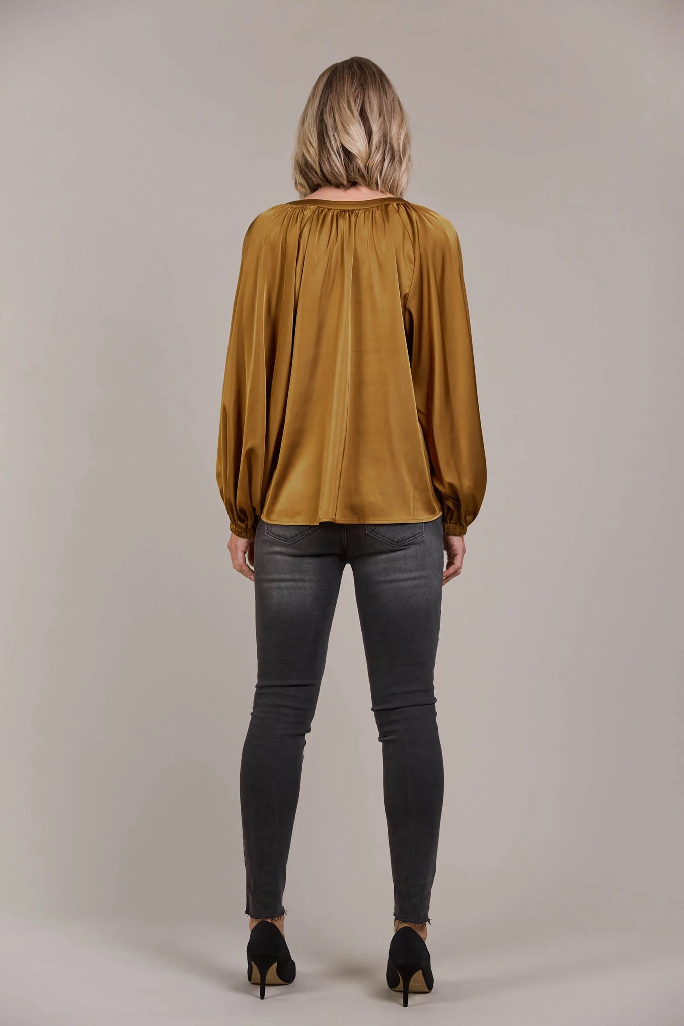 The Ivy Blouse, made from a sumptuous silk-like fabric, is a versatile piece that transitions effortlessly from day to night. In the AM, pair it with sleek suiting and boots for a sophisticated office look. Then, take it into the PM for a girl's night with a skirt, kitten heels, and bold accessories. This luxurious blouse exudes elegance, featuring a V-neck, a chic self-fabric tie, and flowing balloon sleeves for added flair.