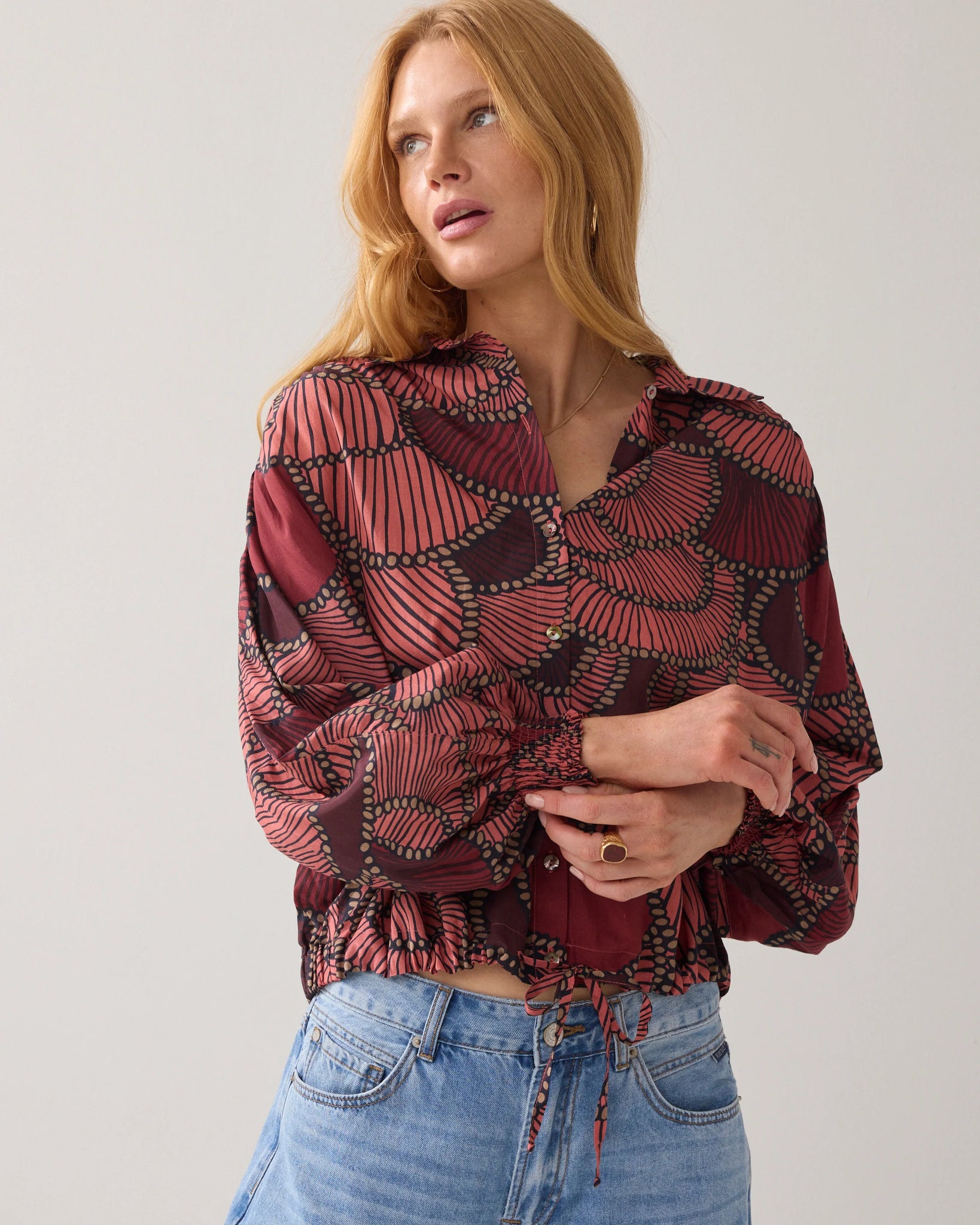Elevate your wardrobe with this stunning all-over print blouse from Summum Woman. Crafted from a breathable viscose-cotton blend, it's designed for effortless comfort and style. The dramatic batwing sleeves feature smocked cuffs for a polished finish, while the generously gathered back panel creates beautiful movement and dimension. An adjustable drawstring hem lets you customize the fit to suit your silhouette perfectly. Whether you're dressing up for an occasion or adding flair to everyday wear, this multicoloured print piece is a versatile essential that commands attention.