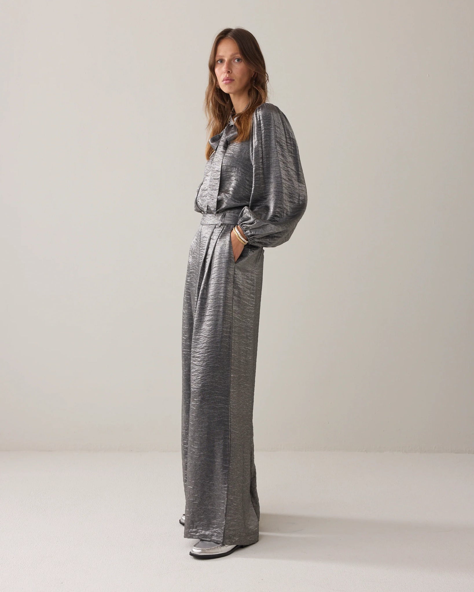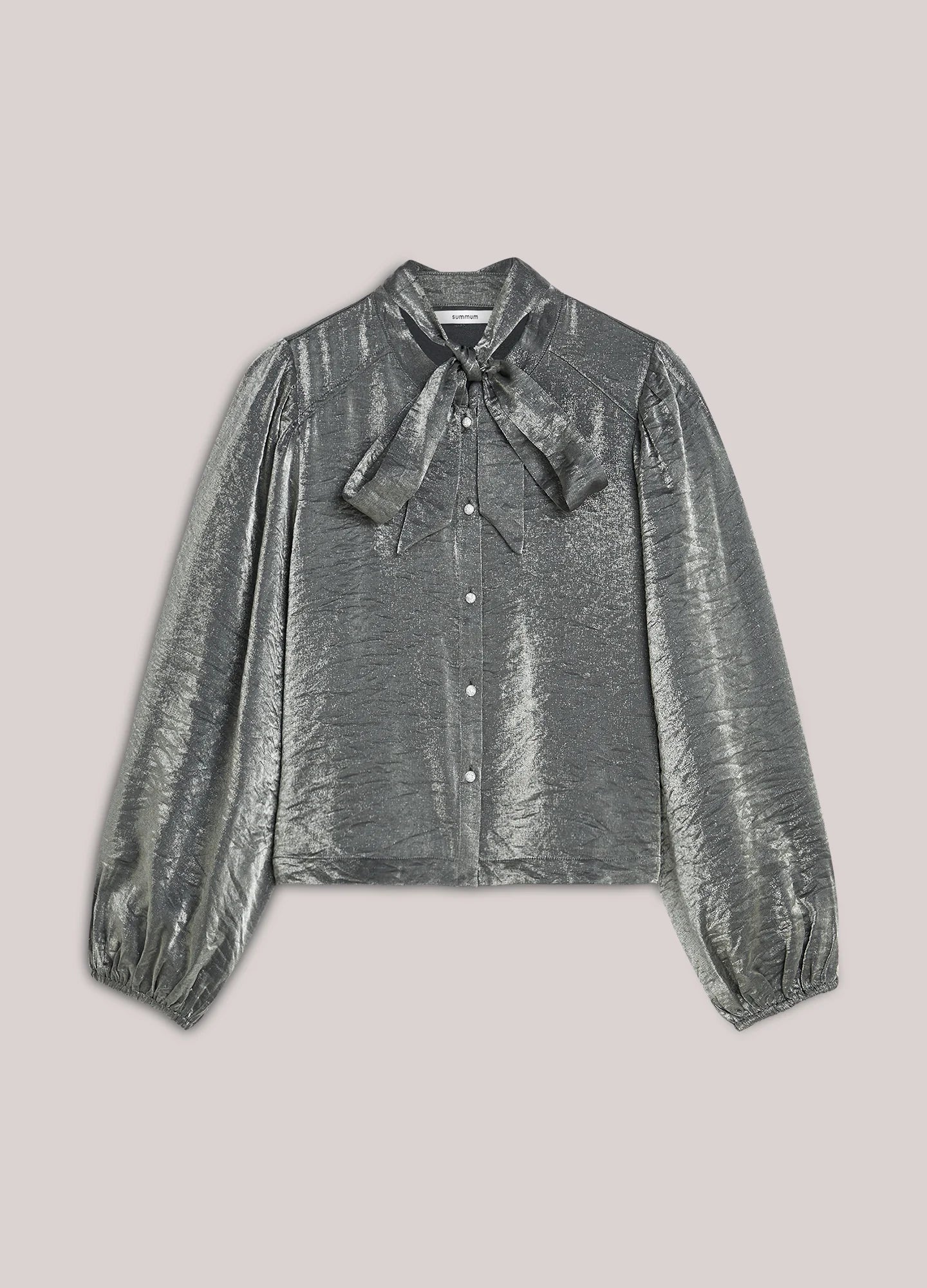 Elevate your festive wardrobe with this stunning metallic shine blouse from Summum Woman. Crafted from a luxurious viscose blend, it features a subtle crush effect that catches the light beautifully. The versatile design includes diamond buttons and an optional bow detail, allowing you to style it for any occasion. A crisp stand-up collar frames the neckline, while elegant puff sleeves with elasticated cuffs add contemporary flair. Perfect for creating sophisticated looks that transition seamlessly from celebrations to everyday elegance.