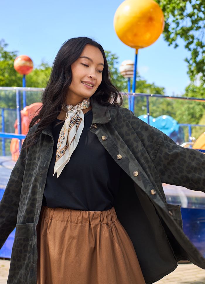 Elegant mini scarf featuring a golden ring detail. Dimensions: approximately 70 x 70 cm. Made from 100% polyester for a smooth finish
